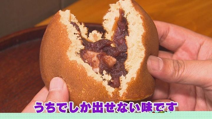 店主の本間さんのお父さんが地域の方々と開発したという『すいか糖』を生地に加えた、名物のどら焼き。