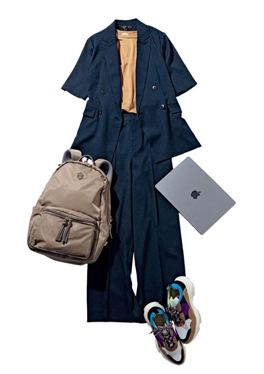 キャメルカットソー¥9,900/IKITSUKE(IKITSUKE笹塚店) ジャケット¥18,920、パンツ¥14,960/インディヴィ(ワールド) リュックサック¥15,950/ペルケ(アンビリオン) マルチカラースニーカー¥19,800/MANA
