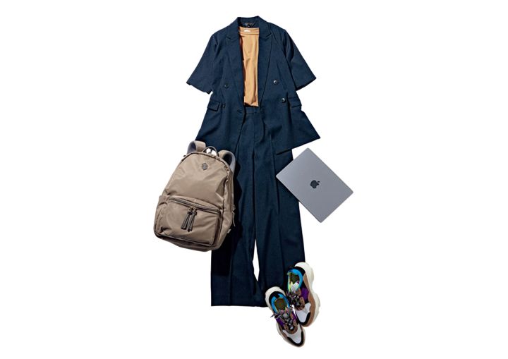 可愛げよりも「デキる」感重視で、ネイビーのジャケットを選択。リネン調の風合いでジャケットコーデを軽やかに。キャメル合わせがこなれてて、信頼できるオーラ、出てます!
