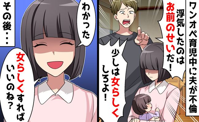 すると夫はすんなり浮気を認め、「浮気したのはお前のせいだからな?お前には女らしさがないっ! 少しは女らしくしろよ!」と逆ギレし始めたのです。