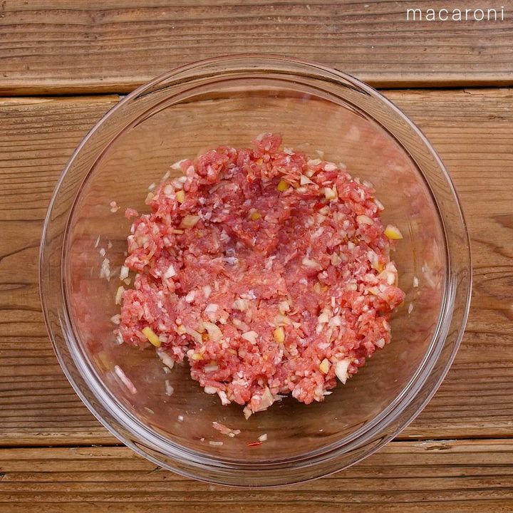1: ボウルに豚ひき肉、長ねぎ、豆板醤を加えてよく混ぜ合わせます。