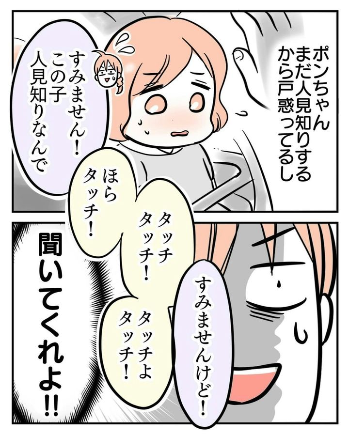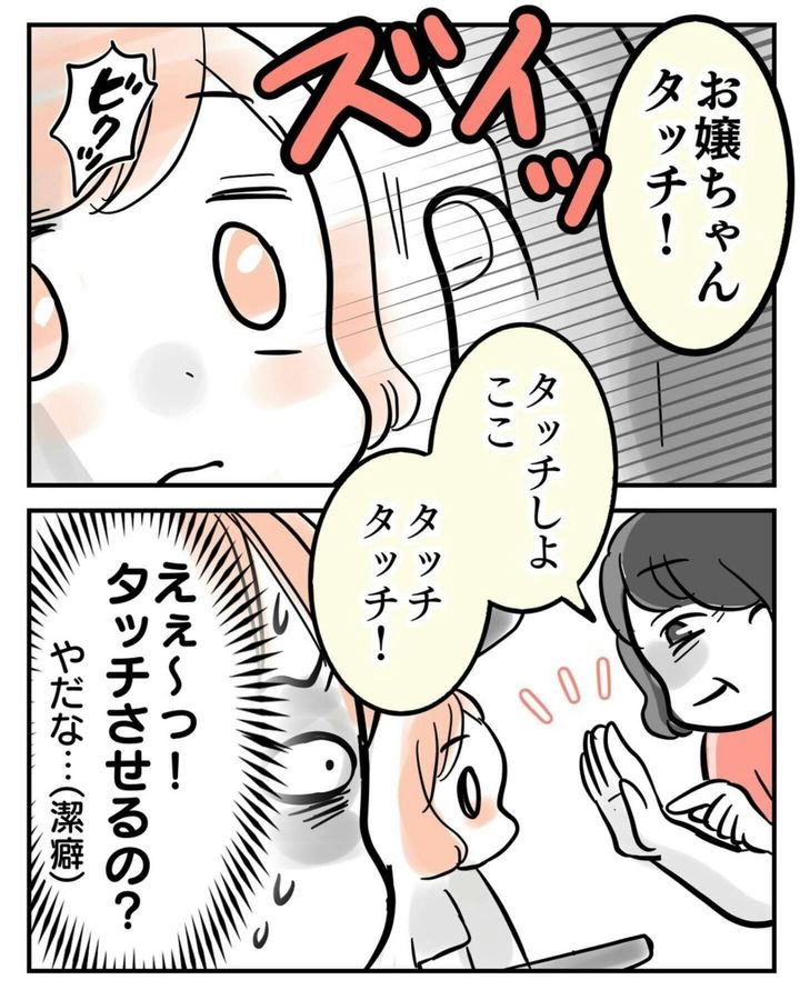 親のほうをまったく見ないというのは、不信感が募ってしまうものですね。さらに、初対面でタッチをさせようとする姿に不快感を覚えます。