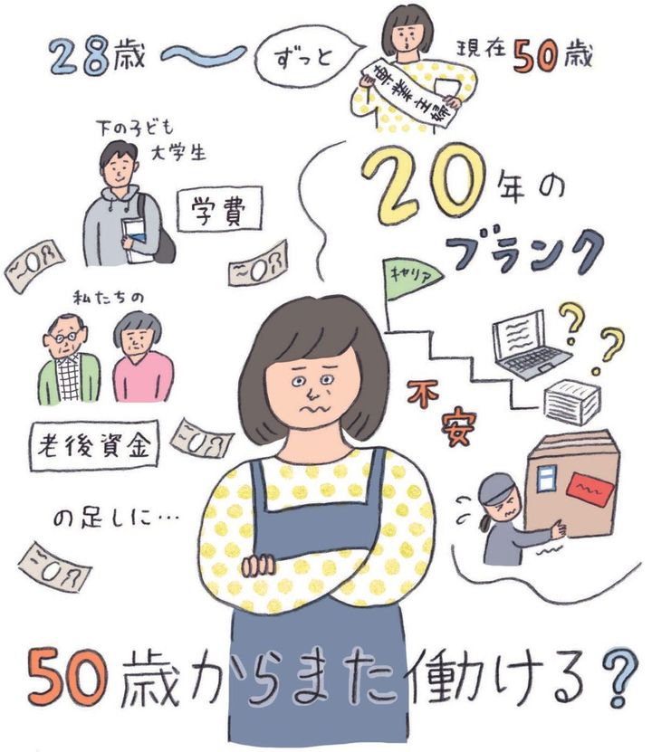 結婚後、子どもができたのをきっかけに28歳で仕事を辞め、それからずっと専業主婦をしています。下の子も大学生になったので、少しでも学費や老後資金の足しになればと、働きに出ようと思いはじめています。でもいざ動きだそうとすると、「20年もブランクがあるのにやっていけるかな」「何のキャリアもない私を雇ってくれるところがあるのかな」「年齢的に体力を使う仕事はきついな」と、あれこれ不安がわいて、最初の一歩が踏み出せません。節約しながら専業主婦を続けたほうがいいのかも? と頭の中で堂々めぐりをしています。