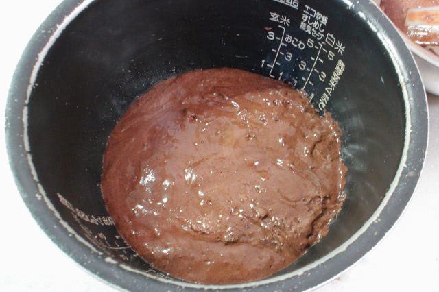 4. 内釜にサラダ油(分量外)を薄く塗り、生地を流し入れて普通モードで炊飯します。