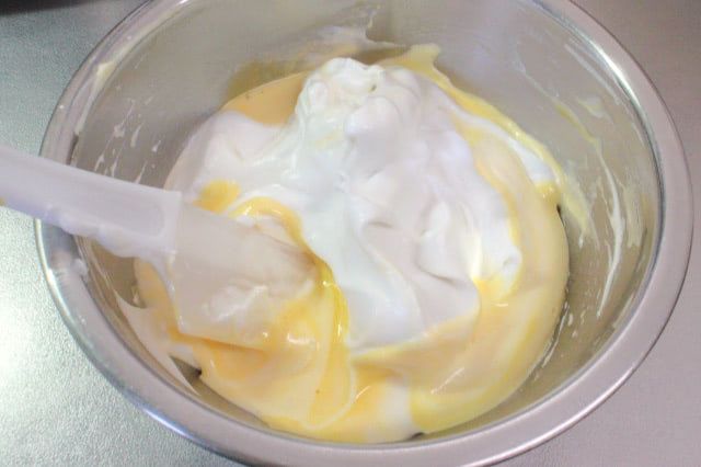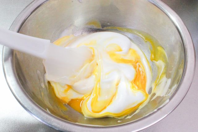 卵黄とメレンゲがなめらかに混ざるように、まずはひとすくいのメレンゲを先に加え、混ぜておきましょう。