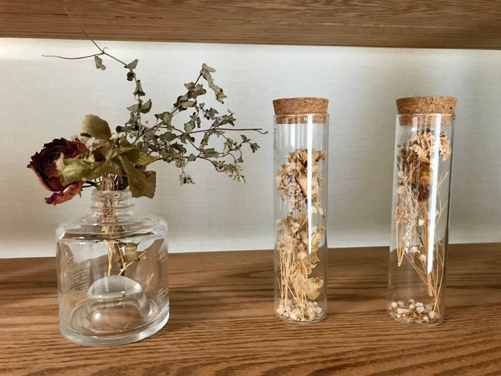 写真は飾った後の生花をドライフラワーにして、ガラスの器や瓶に飾ったものです。いわゆる「枯色(かれいろ)」ですが、自然の色そのままなので、インテリアにも馴染みます。クリア押し花のような平面には入りきらない、バラなどの立体的な草花を飾る場合は、このような瓶もおすすめです。