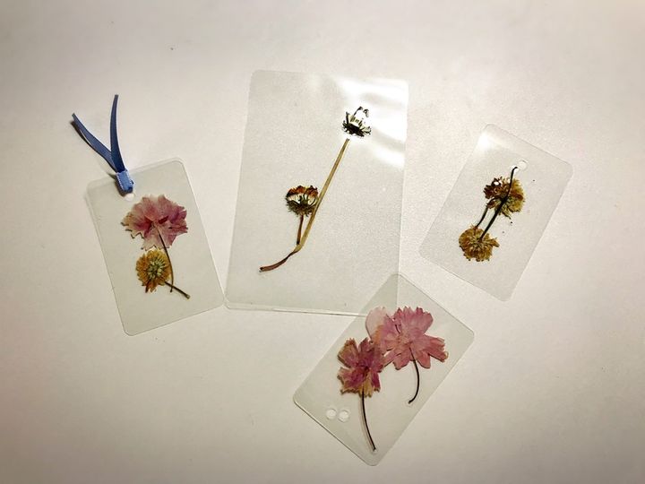 その名も、『クリア押し花』。できた押し花をラミネート加工するだけです。ラミネーターがない人は、厚手で透明のクリアファイルに挟むのでもOK。名刺サイズのラミネートなら、小さな草花にもピッタリです。できたらパンチで穴をあけて、好きな紐を通すとしおりにもなります。