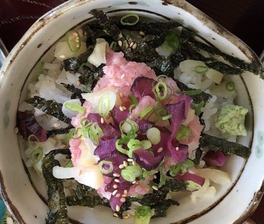 本日の丼ぶりは、マグロのたたき丼でした。刻みのり、白胡麻、ネギにマグロのピンクとしば漬けの赤が、たまりません。