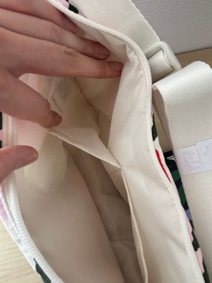 ラウンドショルダーバッグは2種類あって、しましま模様とフラワー柄で各2色展開。私はフラワー柄のピンクとブルー2色買いしました。