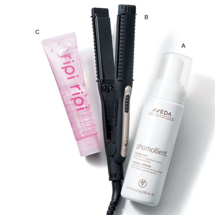 A髪に軽いボリュームと艶を与えてくれるスタイリング剤。フォモリエント スタイリング フォーム200㎖¥2,300(アヴェダ)Bヘアダメージを低減してくれるストレートアイロン。ホリスティックキュア ストレートアイロン¥12,000(クレイツ)Cウェットな濡れ髪が簡単につくれます。リピリピ ヘアグロス63g ¥1,100(アリミノ)