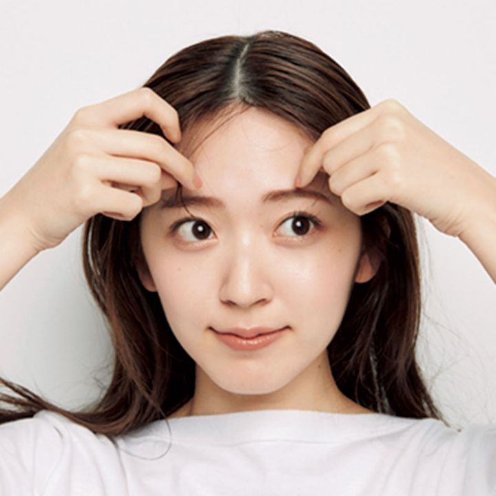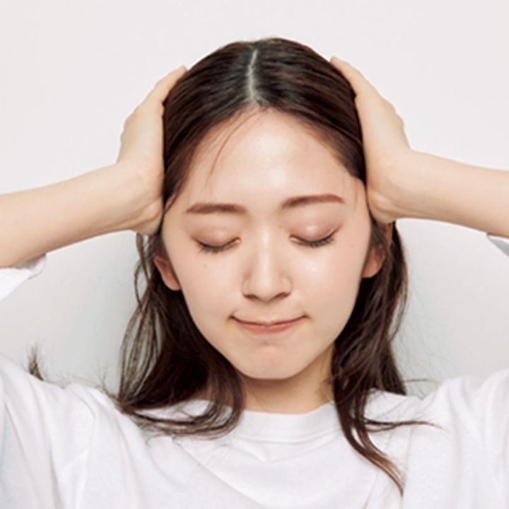 4.Cを手につけ、前髪を少しだけ出します。こうすることで韓国っぽいヘアに。その後、サイドの髪を耳にかけます。