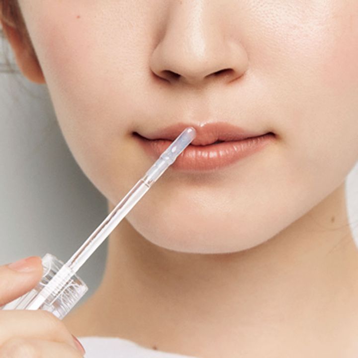 5.さらにDの青みのあるグロスを唇の山だけにのせます。ここに艶をポイント的にのせるだけで、唇がぷっくりと見えます。