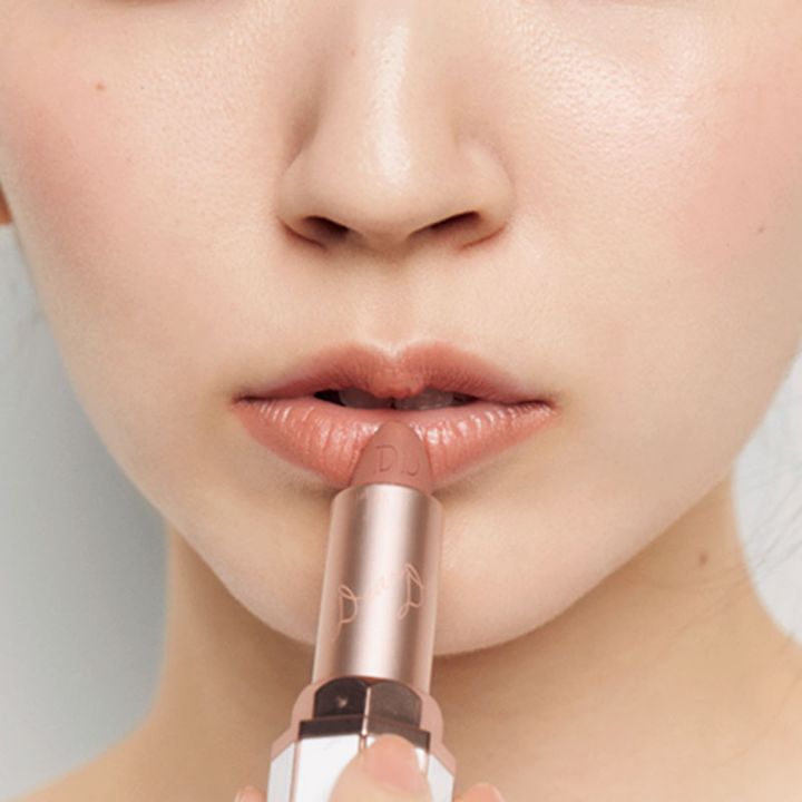 4.コンシーラーで唇の赤みと口角まわりのくすみを消したら、Cの赤みのあるマットなベージュを唇に直塗りします。