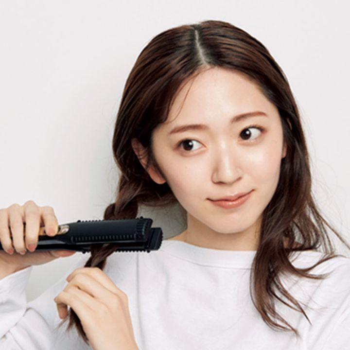 2.次に髪を二つに分けて、それぞれ三つ編みをします。その後、Bのストレートアイロンで三つ編みをプレスしていきます。