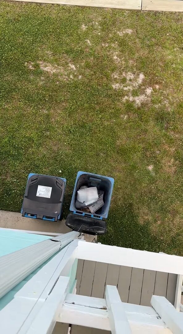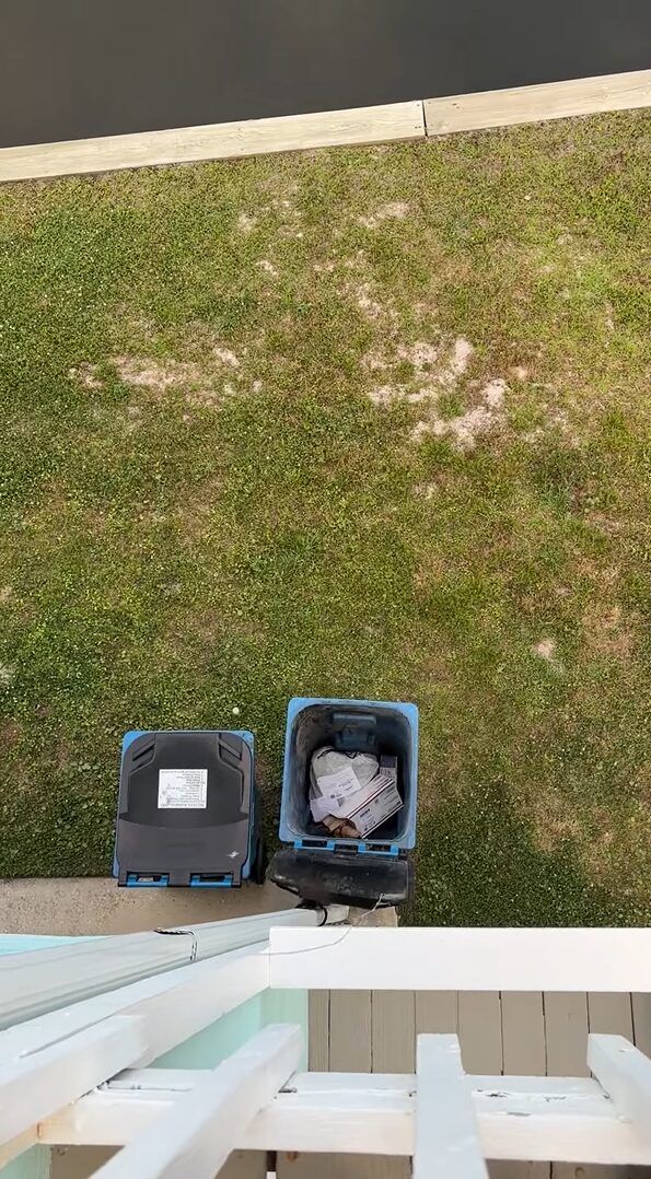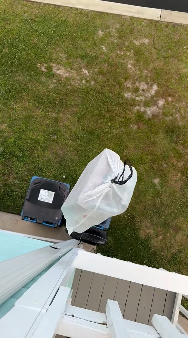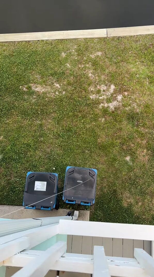 それを面倒だと考えた撮影者さんは、ある発明をひらめきました! ベランダから見下ろした場所にある外に置かれたそのゴミ箱のフタには紐が取り付けられています。