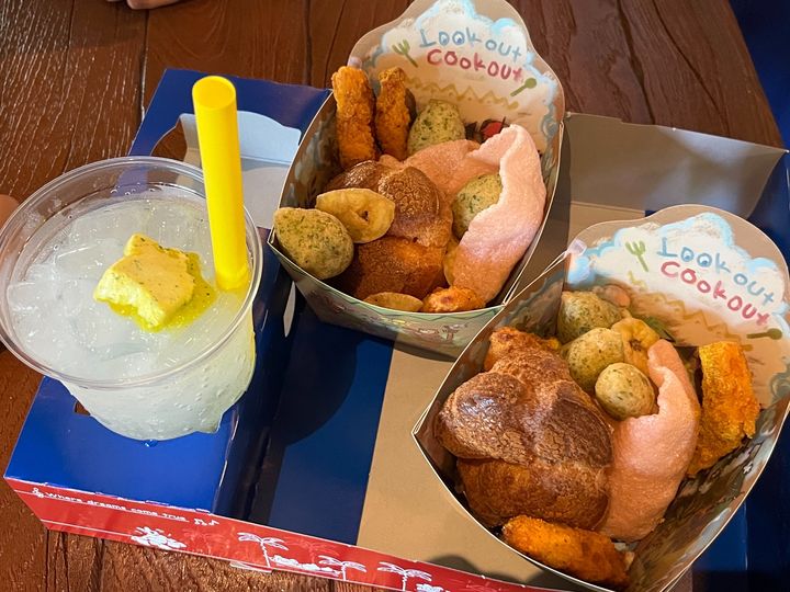 チキンテンダー、ポップオーバー、海藻フリッター、バナナチップス、シュリンプチップスが入っています。食べ終わった器を広げると、子どもが喜ぶ仕掛けが!