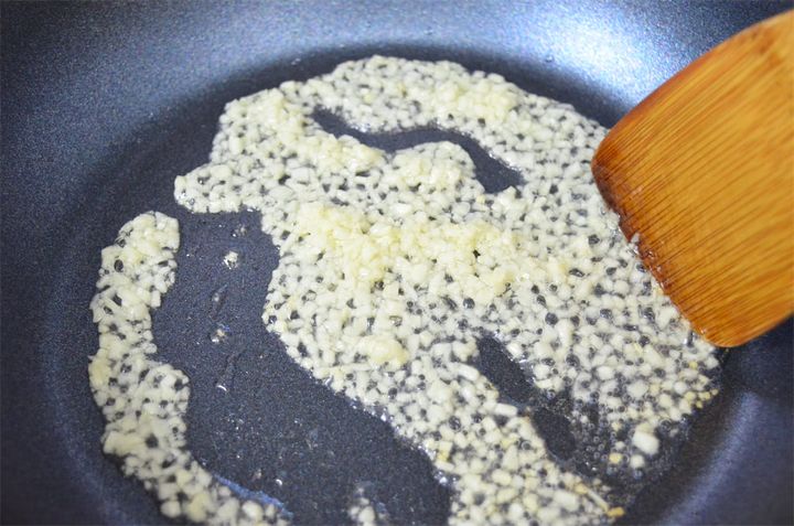 2.フライパンにサラダ油、みじん切りにしたにんにくを入れ、中火で炒める。