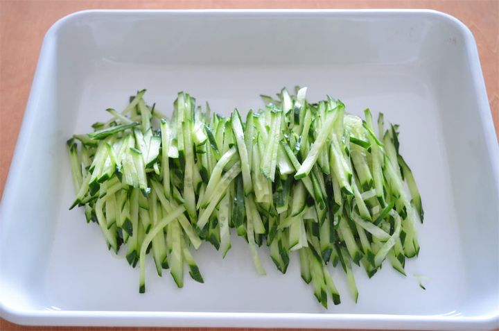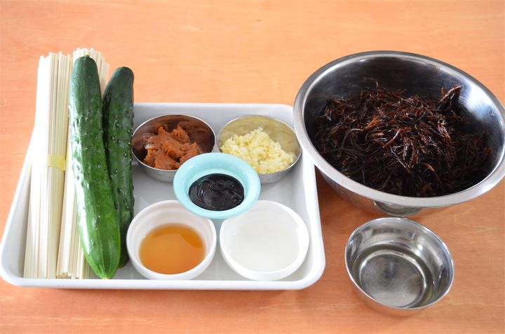 1.戻したひじきを細かく刻み、きゅうりは千切りにしておく。