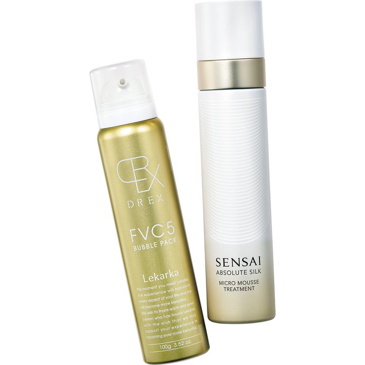 左から:肌トーンを上げる泡パッ ク化粧水。DREX FVC5 BUBBLE PACK 100g ¥13,200(レカルカ)肌に馴染ませるとシルキーに変化する炭酸泡で潤いが持続。センサイ AS マイクロ ムース トリートメント s 90g ¥19,800(カネボウ化粧品)
