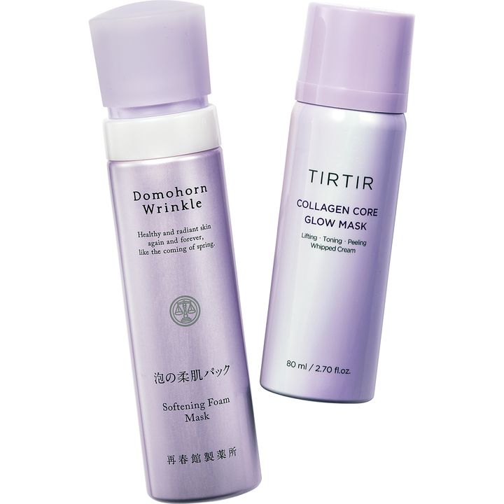 左から:濃厚泡パックで肌を解きほぐし素肌力を格上げ。ドモホルンリンクル 泡の柔肌パック 80g ¥13,200(再春館製薬所)9種コラーゲン配合の濃密泡パック。つるんとしたハリ肌に。COLLAGEN CORE GLOW MASK 80ml ¥2,420(ティルティルジャパン)