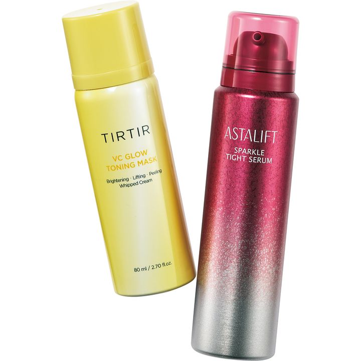 左から:細かな泡が角層まで浸透、クリアなツヤ肌に。VC GLOW TONING MASK 80ml ¥2,420(ティルティルジャパン)弾ける泡の心地よい刺激で毛穴をキュッと引き締め。アスタリフト スパークル タイトセラム 50g ¥4,400(富士フイルム)