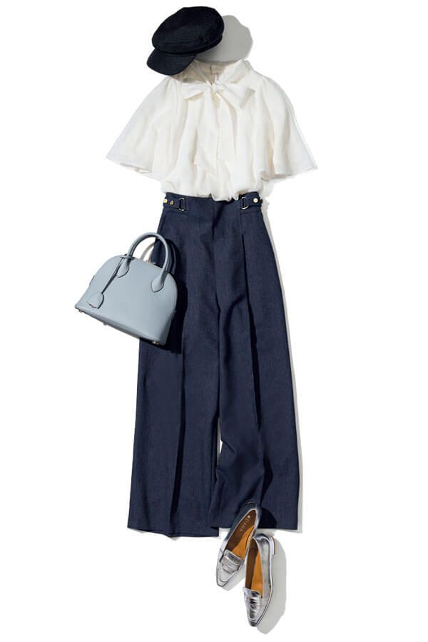 ブラウス¥11,000、キャスケット¥4,400/ともにNoëla パンツ¥20,900/ジャスグリッティー バッグ¥176,000/ボナベンチュラ ローファー¥18,150/ダイアナ(ダイアナ 銀座本店)