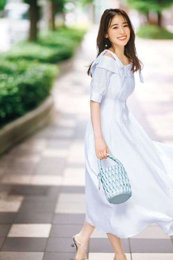 真っ白ドレスからのぞかせた素肌で清楚かつ健康的な女性らしさを演出