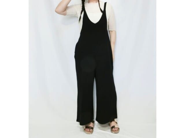 このオールインワンは、フリーサイズの1サイズ展開。肩紐が調節可能で、低身長の人から165~6㎝の人くらいにおすすめです。ゆったりとしたシルエットのオールインワンなので、普段M~Lサイズを着用している人向けの印象です。肩紐を長くしてしまうとシルエットが微妙かも……。