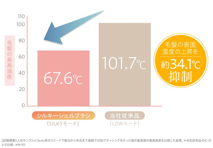 「シルキーシェルブラシ」では最高温度を140℃に設定。髪自体の温度を100℃以下に留める「シルキーソフトヒーター機能」を搭載し、髪内部の水分は守りつつ、ツヤ感とまとまり感のみが得られるような温度設計を実現。