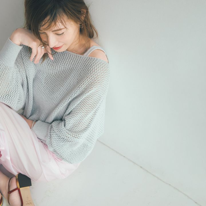 ニット¥17,600(ルージュ・ヴィフ/ルージュ・ヴィフ ラクレ ルミネ新宿店)タンクトップ¥5,500(バナナ・リパブリック)パンツ¥26,400(ドレスレイブ/ジオン商事)サンダル¥22,000(銀座かねまつ/銀座かねまつ6丁目本店)ピアス¥80,300バングル¥311,300(ともにウノアエレ/ウノアエレ ジャパン)リング¥77,000(マリハ)