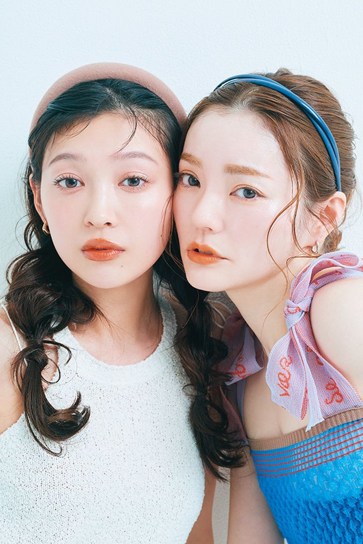 まず全体をヘアアイロンでゆるウエーブに。バームをなじませてからツインの三つ編みをつくり、編み目を指先で大胆にほぐす。前髪は上げてカチューシャをつけたら、うぶ毛を少し引き出してほんのりスウィートに。