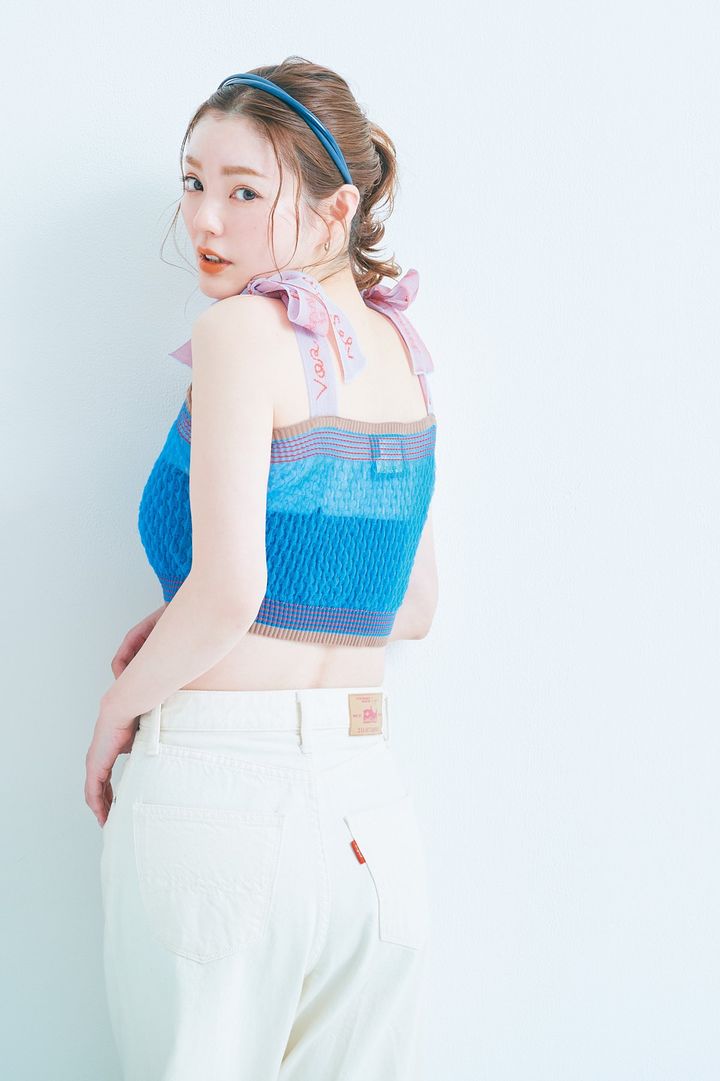 首まわりをすっきり見せるコンパクトなアップヘアは、ブルーの2連カチューシャで夏を先取り。