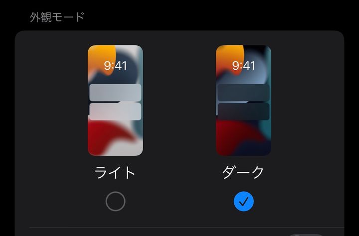 本来の設定は上のようなライトモードだと思いますが、ダークモードにすることで画面を黒基調にすることができます。