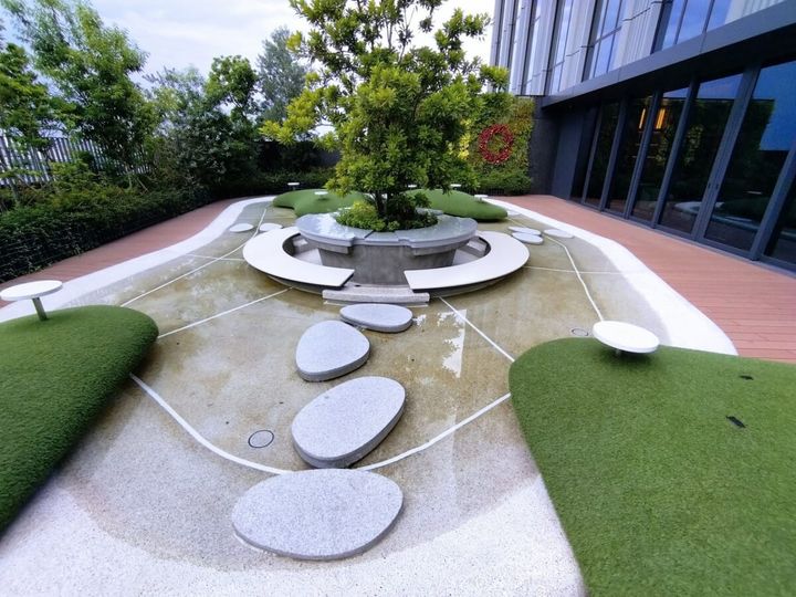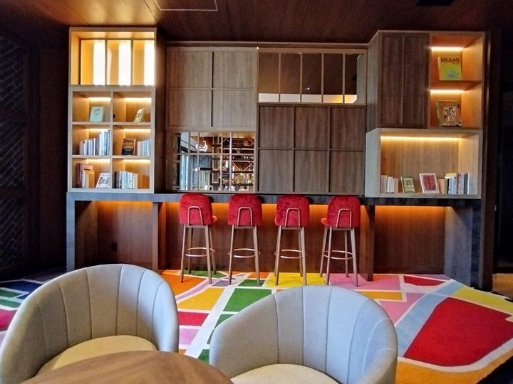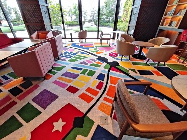 色鮮やかなラウンジがあったり…… このラウンジの床は、実は五反田の地図に! ☆印がホテルの場所で、黒い線路をたどった上にあるのが五反田駅と遊び心たっぷり!
