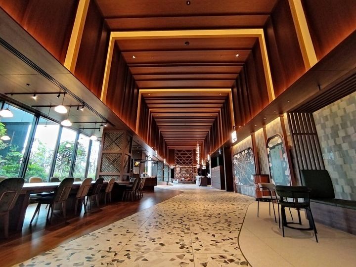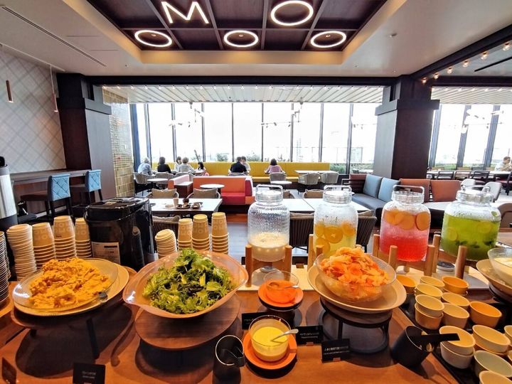 朝食は「OMO」の天井照明が輝く「OMOカフェ&バル」で。