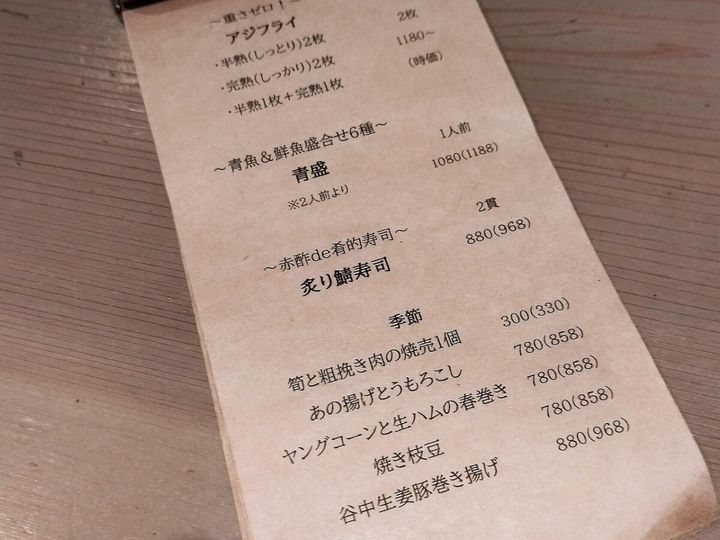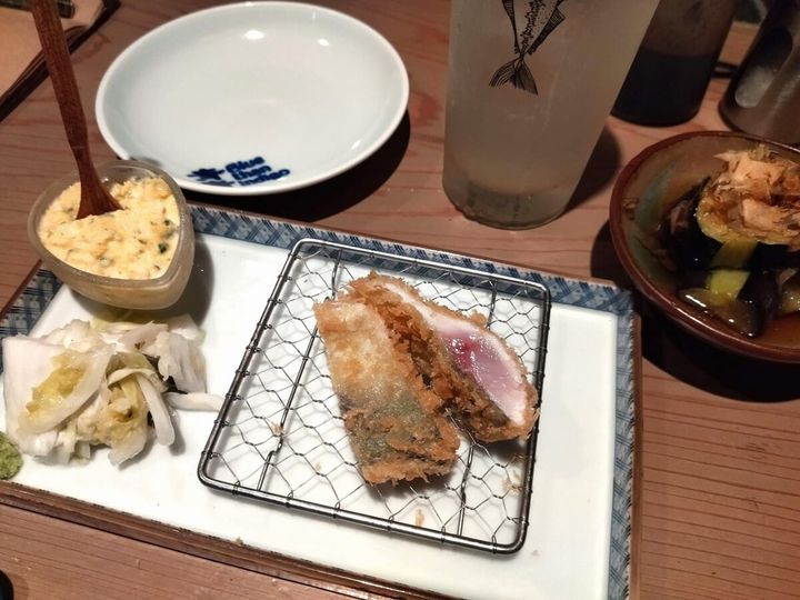訪ねたのは、ホテルから5分ほどの「酒肴あおもん」。アジやサバなどの青魚を楽しめる小ぢんまりした店なのですが、ココの名物は“重さゼロのアジフライ”。たった30秒で揚げられる薄衣のアジフライです! うわぁ~、完全にレア状態。鮮度が高いからこそできる技で、ホントに0gの軽さなのに衣はサクサク、アジはとろけるレアの旨み。新食感の味わいは、まずは素材の味を楽しめる塩かワサビでいただいてください。お好みでニラ醤油やタルタルソースのアレンジをどうぞ。