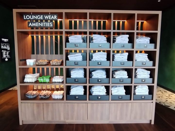 エレベーターホール前には、ルームウェアなど各種アメニティが取りそろえられているので、必要なものをピックアップ。
