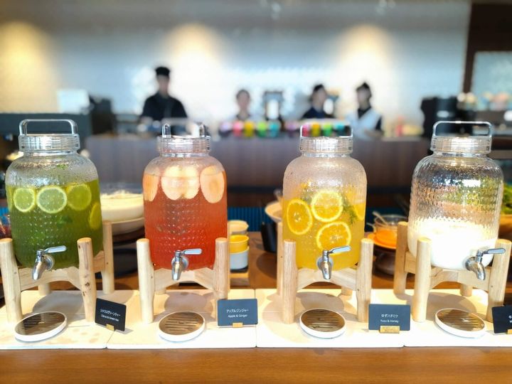 お味噌汁に加えて、ブッフェスタイルの各種サラダやフリードリンクもあるので、ゆっくりと召し上がれ。もちろん洋食としては、アメリカンブレックファーストも用意されています。