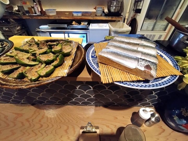 レアの後には、完熟のアジフライが出てくるので食べ比べを楽しめます。カウンターに並べられた「炙り鯖寿司」も食べてみたかったのですが、30分間という時間制限あるので断念。時間内であれば追加料金でオーダーも可能とのこと。