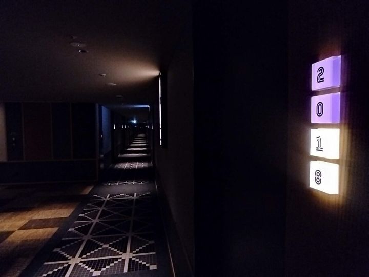 灯りの落とされた客室フロアの廊下には、ネオンを思わせるルームナンバーが光っていて、ココにも五反田のエッセンスが。フロアによって色も異なるのだとか。