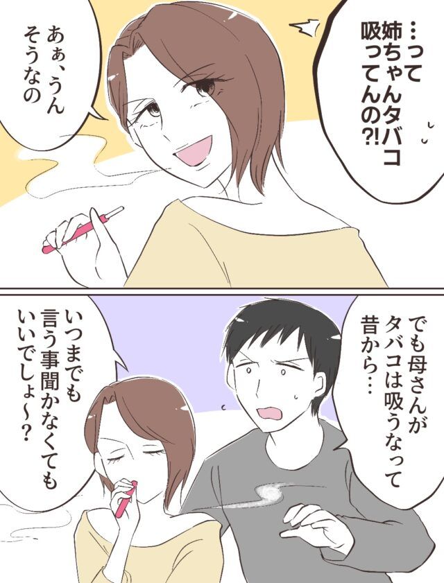 おやつを食べながら「タバコ吸っていい?」と聞く義姉に「喫煙者だってお母さんには言わないでよ!お母さんタバコ嫌いだから」と言いながらとっととタバコをくわえる義姉、「ごめんねー。もう吸わないとやってらんなくて」と言う義姉に「謝るなら吸わないで!?」とツッコむマリコさん・・