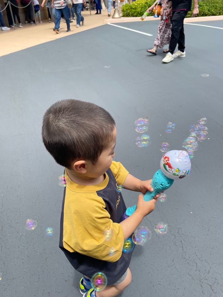 ワールドバザール内をぶらぶらしたり、「早めにポップコーンをゲットしておくと◎」とアドバイスをもらっていたので、ポップコーンを購入。他にもパスタスナックやシャボン玉が出てくるオモチャも購入。オモチャを手にするまでグズグズだった長男でしたが、ノリノリで歩くように。