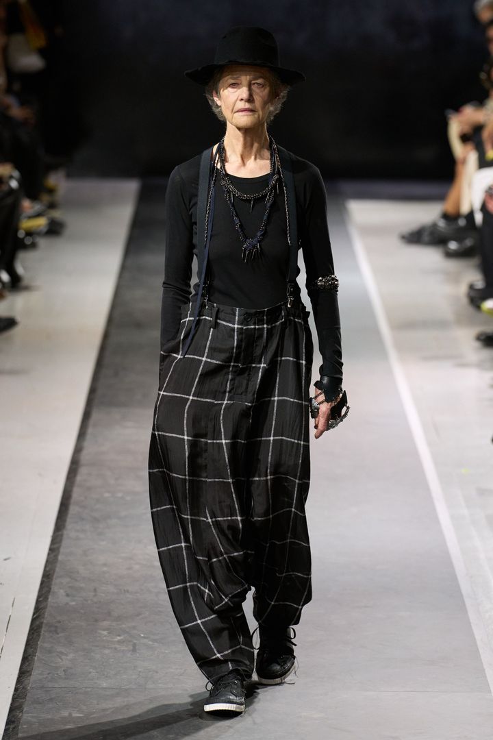 そのすぐそばに立っていたのは、数分前にサプライズでランウェイに登場したシャーロット・ランプリングだ。彼女は過去に、ヨウジヤマモトの1998-99年秋冬のショーを歩いたことがある。今思えば、その時もメンズだった。フェドーラハットにサングラスを纏った彼女は、小柄ながら大女優の貫禄と中性的な雰囲気を醸していた。