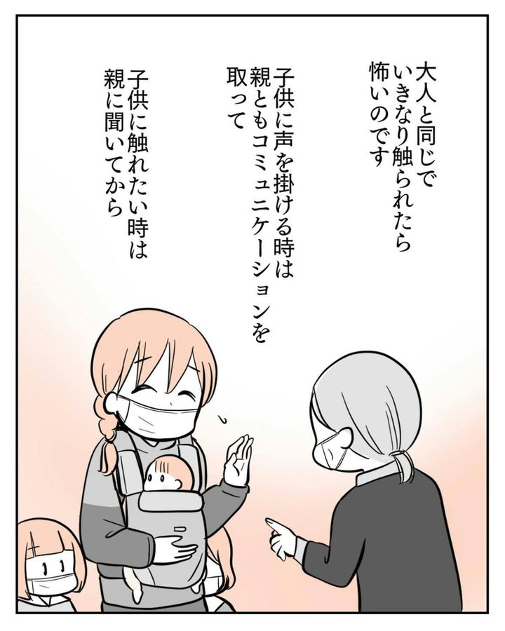 世の中には「子どもは勝手に触ってもいい」と思っている人がいるのかもしれません。しかし子どもも大人と同じで、同意を得ずに触ってはいけません。赤ちゃん等で会話ができないときは、保護者の許可を得るべきですね。コミュニケーションを取るためには、最低限のマナーは欠かせません。