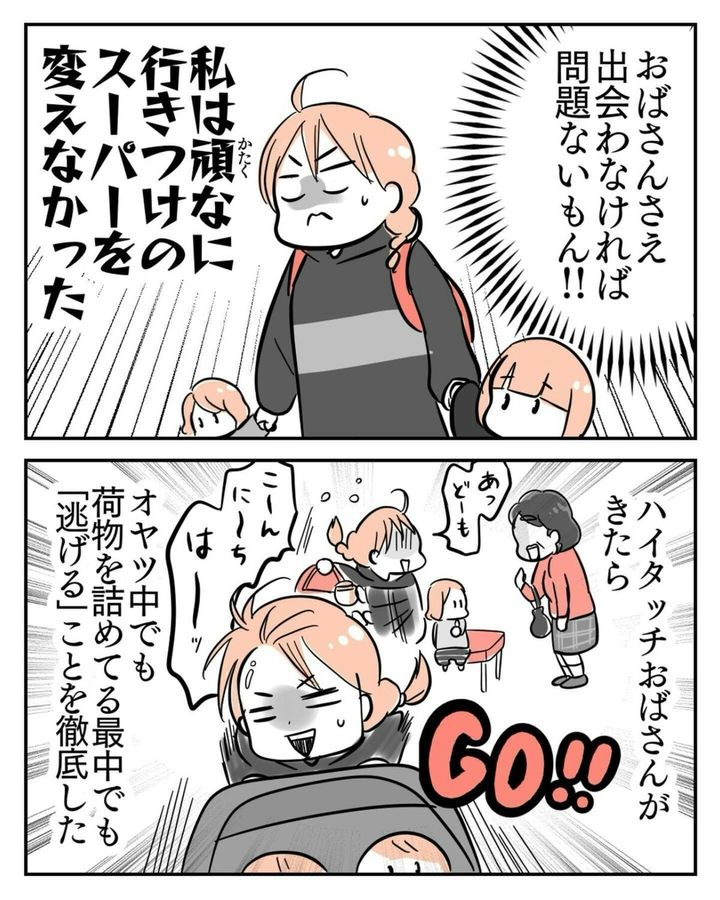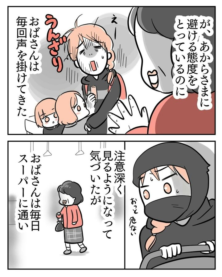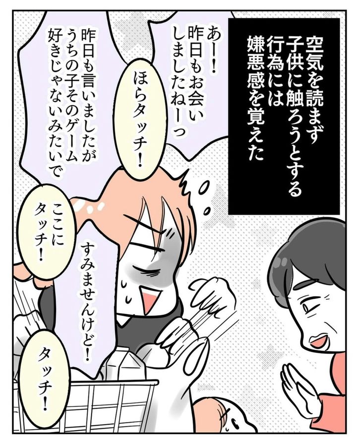 本作では、著者・サヤさんが2歳の双子の子育てをしていたとき、子どもに勝手に触ろうとしてくる女性と遭遇した体験談が描かれています。親が「やめてください」とハッキリと拒絶しても、親を無視した行動をとる女性。話が通じない相手には、恐怖を感じるものです…。