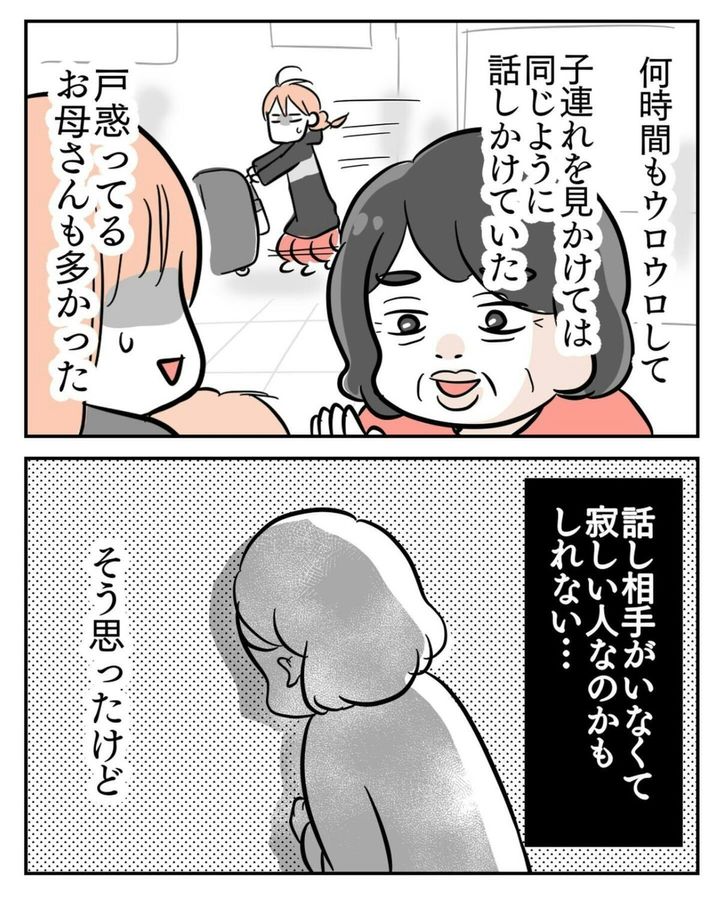 注意深く見るようになってから、この女性は同じような行動パターンを繰り返していることに気づきました。さみしさを感じている人なのかもしれませんが、それでも、勝手に子どもに触ろうとする行動は良いものではありませんね。