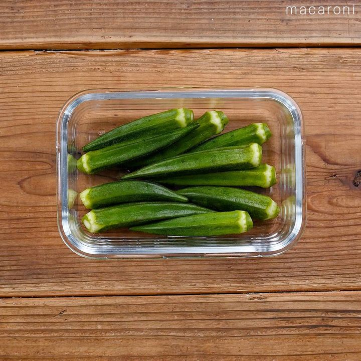 オクラはレンジ加熱の際、破裂の恐れがあるので、爪楊枝などで数カ所穴を開けてから加熱してください。