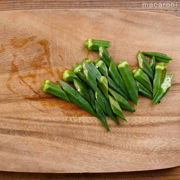 こちらのレシピでは大きめに切っていますが、オクラは大きく切ると食感がよく、小さく切ると粘り気が強くなります。お好みの大きさに切ってお作りください。