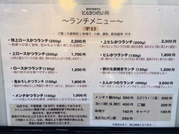 豚肉料理専門店とんかつのりでは、健康が約束された血統SPF豚を使用した豚肉料理をいただくことができます。ランチタイムは、11時30分~14時30分までです。特上ロースかつ・上ロースかつ・豚の生姜焼き等様々なランチをいただけます。ごはん大盛り無料・味噌汁・小鉢・漬物・黒烏龍茶付きとボリューミーなランチがいただけますよ!!