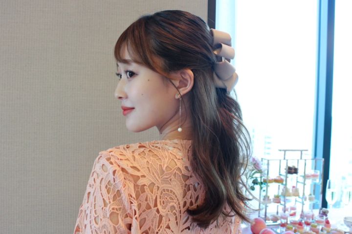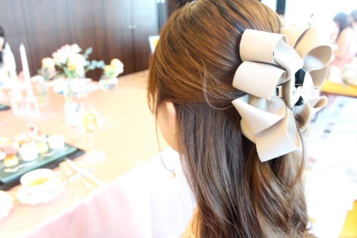 ヘアはアイロンで巻いてからハーフアップに。大ぶりリボンのヘアクリップは3coinsのもの。